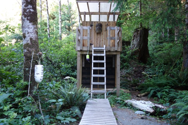Toilet facilities are a unique feature of the West Coast Trail. They are decorated by all manner of interesting paraphernalia, usually stuff that has been washed ashore. Buoys are a common feature and most have been carved to reflect the memory of some previous trekker who has left their initials in the buoys.